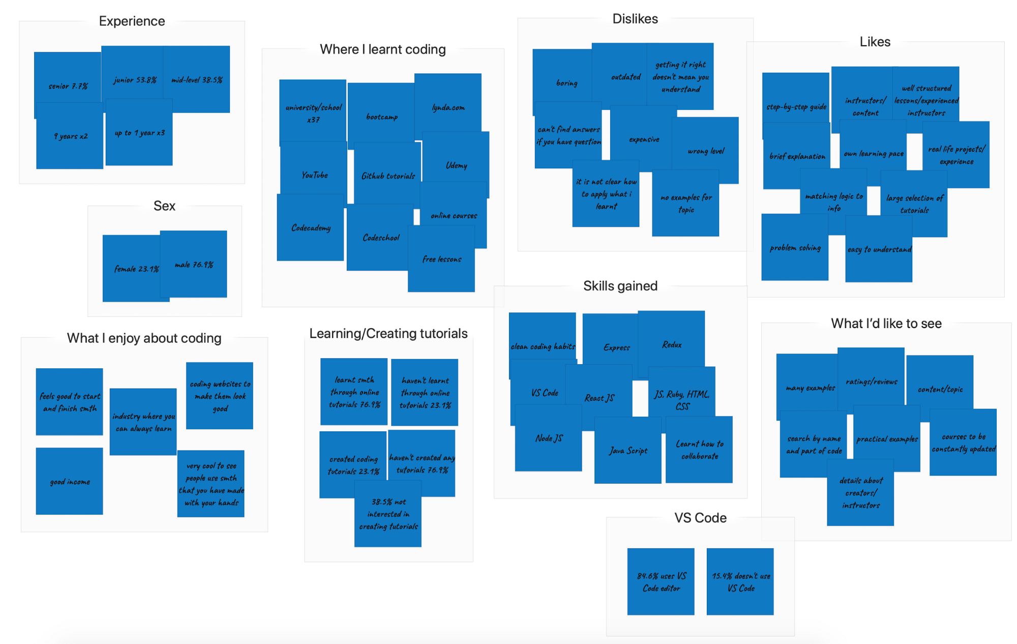 The key findings in our surveys were that the coding world is dominated by men. Out of the People who took our survey 76.9% of them were male where as only 23.1% were female. The majority of people surveyed learnt how to code via an online platform. The most popular websites that people use to take coding tutorials are Codecademy and Udemy. We asked the interviewees and people who took the survey what they liked most about these tutorials and this is what they said: