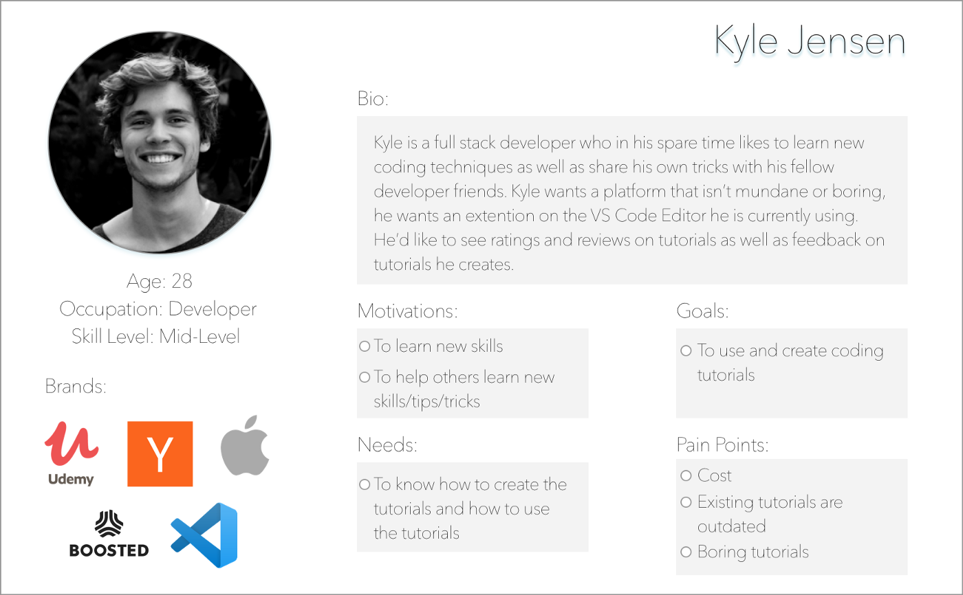 We created Kyle Jensen, a 28 year old full stack developer who likes to take coding tutorials in his spare time to learn more useful tips and tricks. Kyle is our perfect user as he is a mid-level developer who already is beyond the beginner level of coding and would be more interested in not only taking coding tutorials but also creating his own coding tutorials.