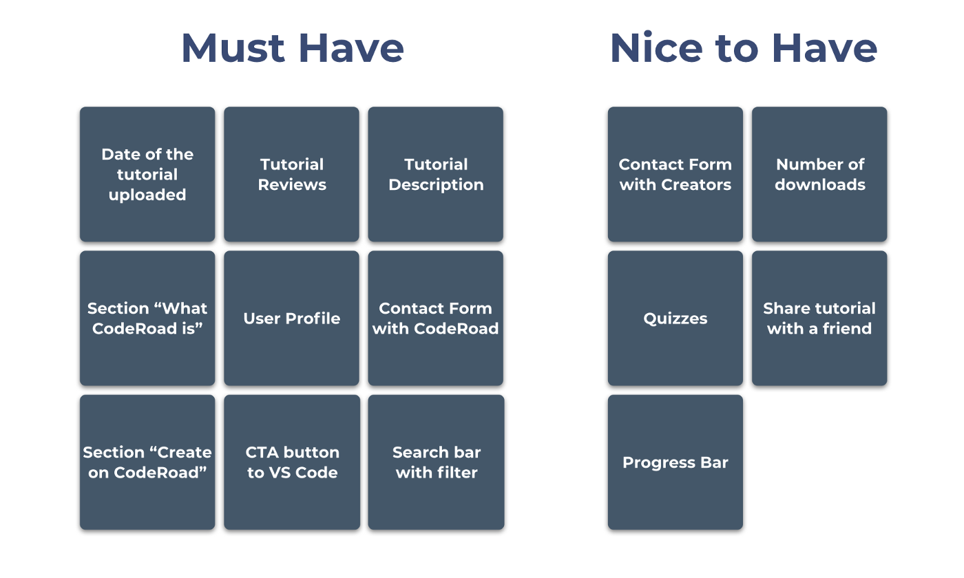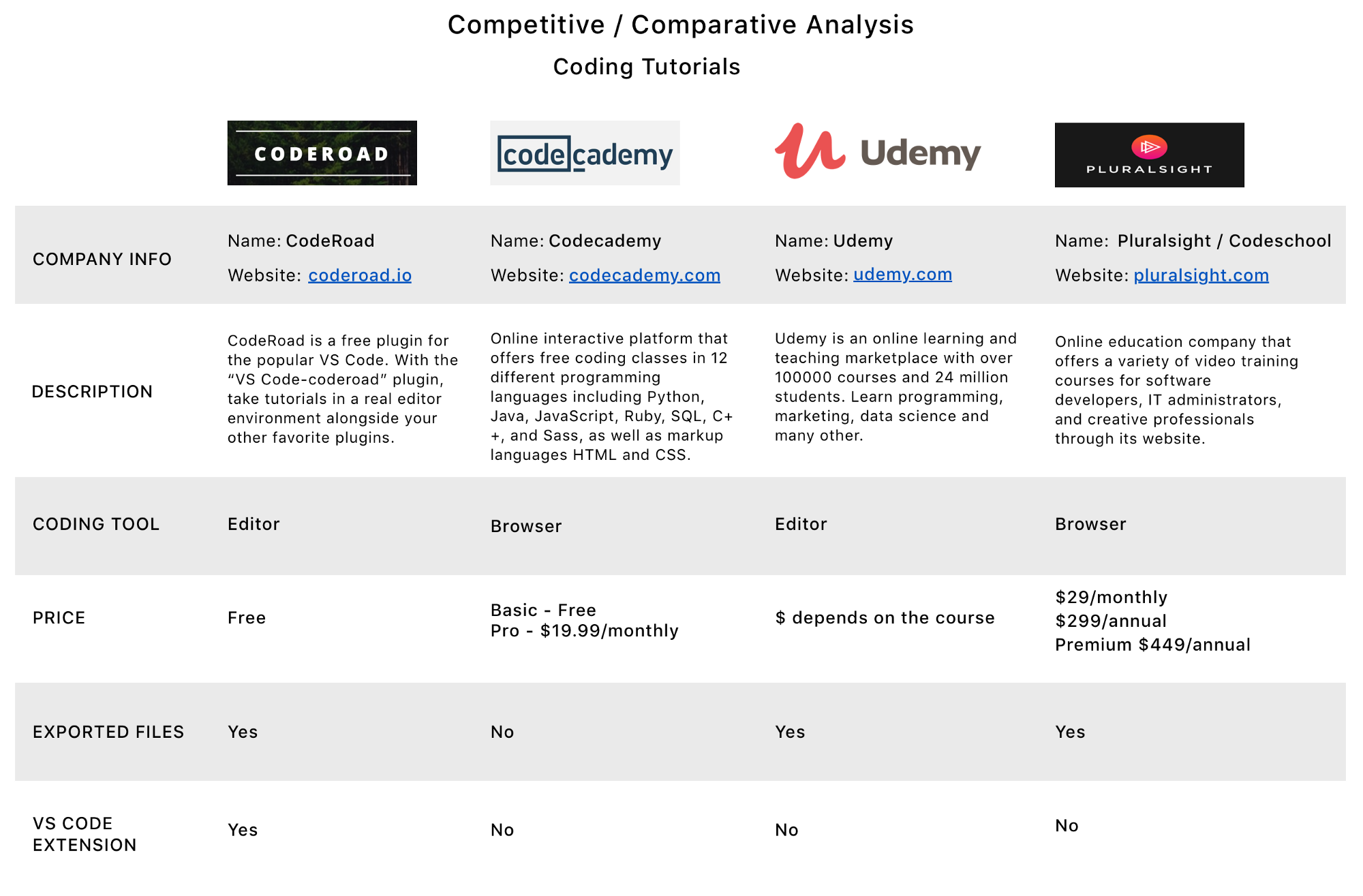 Through our analysis we found that every competitor charged some sort of fee for users to be able to take tutorials. None of the competitors used a VS Code Editor extension. With this analysis we came to the conclusion that promoting a free platform for potential CodeRoad users would be a great way to separate CodeRoad from the competitors.