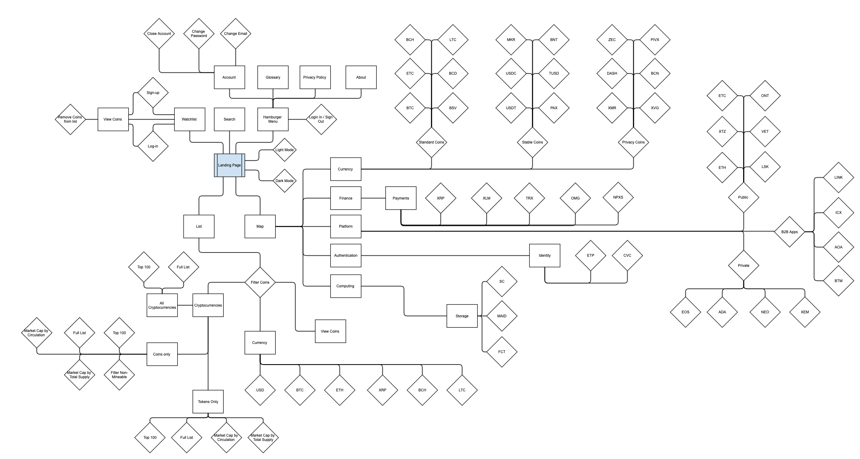 User Scenarios: Writing user scenarios helped us determine what we wanted on our feature list for the Coin Map website. This scenario shows us how Landon could potentially interact with the Coin Map website to learn about A specific crypto coin.