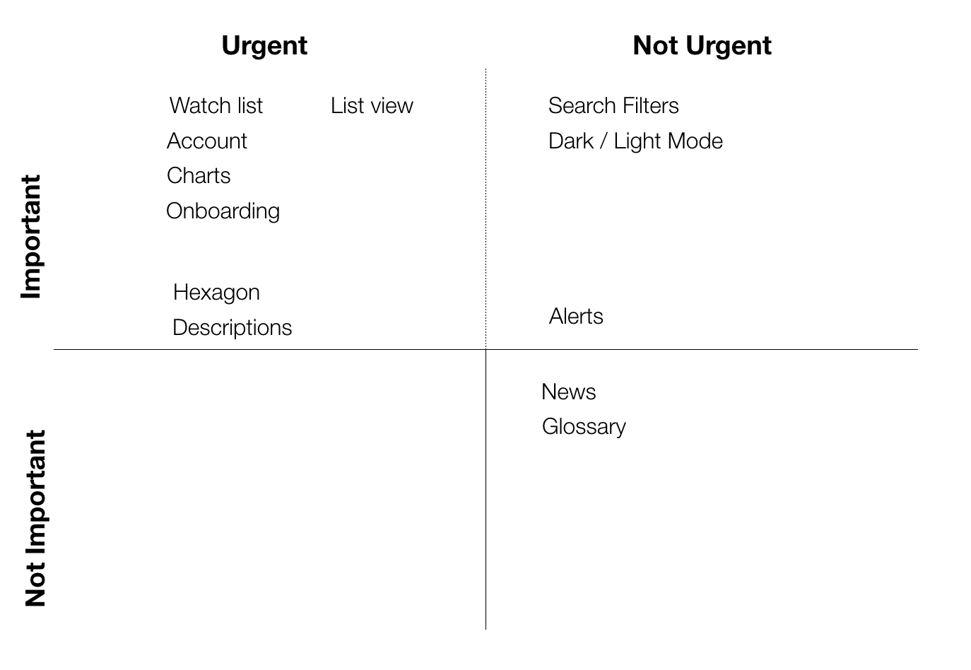 MVP and Feature Prioritization: Our team used the Eisenhower diagram to prioritize which features we would need for our MVP and which features were unnecessary and could be potentially added later.