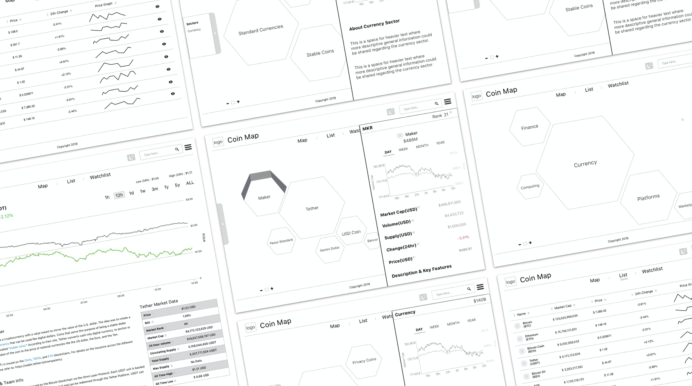 Mid-fi Wireframes: After we completed our testing and revised our paper prototypes we moved onto creating mid-fi wireframes in Sketch. As you can see, our team created a website that would draw the user into wanting to learn more about cryptocurrency. We wanted something simple that wouldn’t complicate or confuse the user. We wanted the user to be able to navigate through the website with ease. We wanted the landing page to really capture the attention of the first time user. Our goal was for any person who opened the Coin Map website for the first time was for them to start clicking through the interactive learning tool to dive deeper into the types of coins and the crypto terminology.