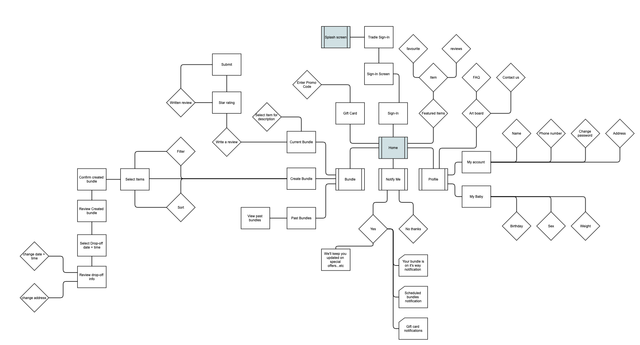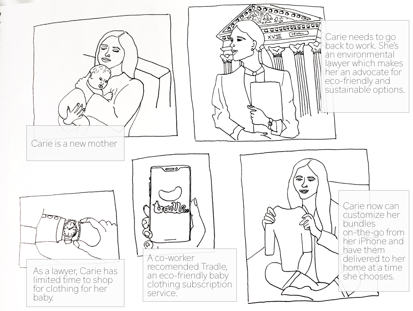 Story Board and Journey Map: We created our storyboard as Carie going back to work and not having the time to shop for baby clothes, we also emphasized Carie as being environmentally conscious. With these concerns in mind, we have Carie’s co-worker recommend to her the Tradle app.