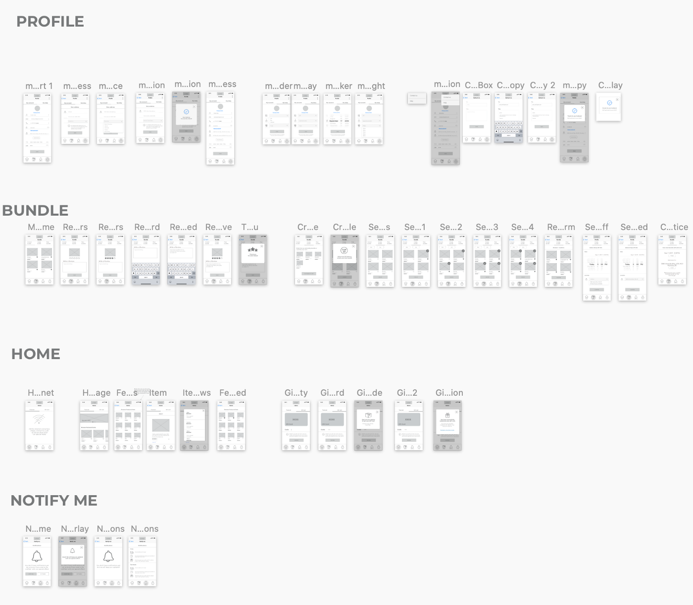 Mid-Fi Prototype: After we completed our testing and revised our paper prototypes we moved onto creating mid-fi wireframes in Sketch.As you can see, our team created the app with minimalism in mind, we wanted something simple that wouldn’t complicate or confuse the user. We wanted the user to be able to navigate through the app with ease. Having the navigation tab bar at the bottom for easy accessibility. We needed to create around 50 wireframes in order to properly show the features that we created.
