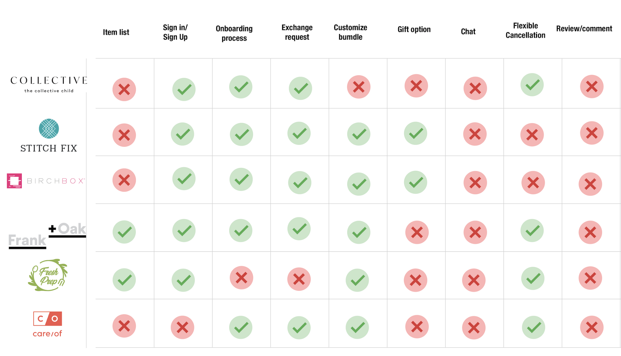 Competitive and Comparative Analysis: We couldn’t find a great selection of infant clothing subscription services. So we ended up spending a lot of time researching different clothing subscription services as well as other subscription services for items such as make-up, women’s clothing, and food.